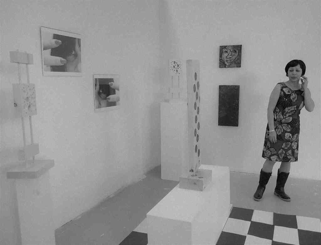 La protagoniste se tient là. Elle est en robe fleurie et bottes de pluie. Elle se trouve entre deux œuvres qui ne se parlent pas. C’est dans un espace trop blanc, trop propre… trop faux.