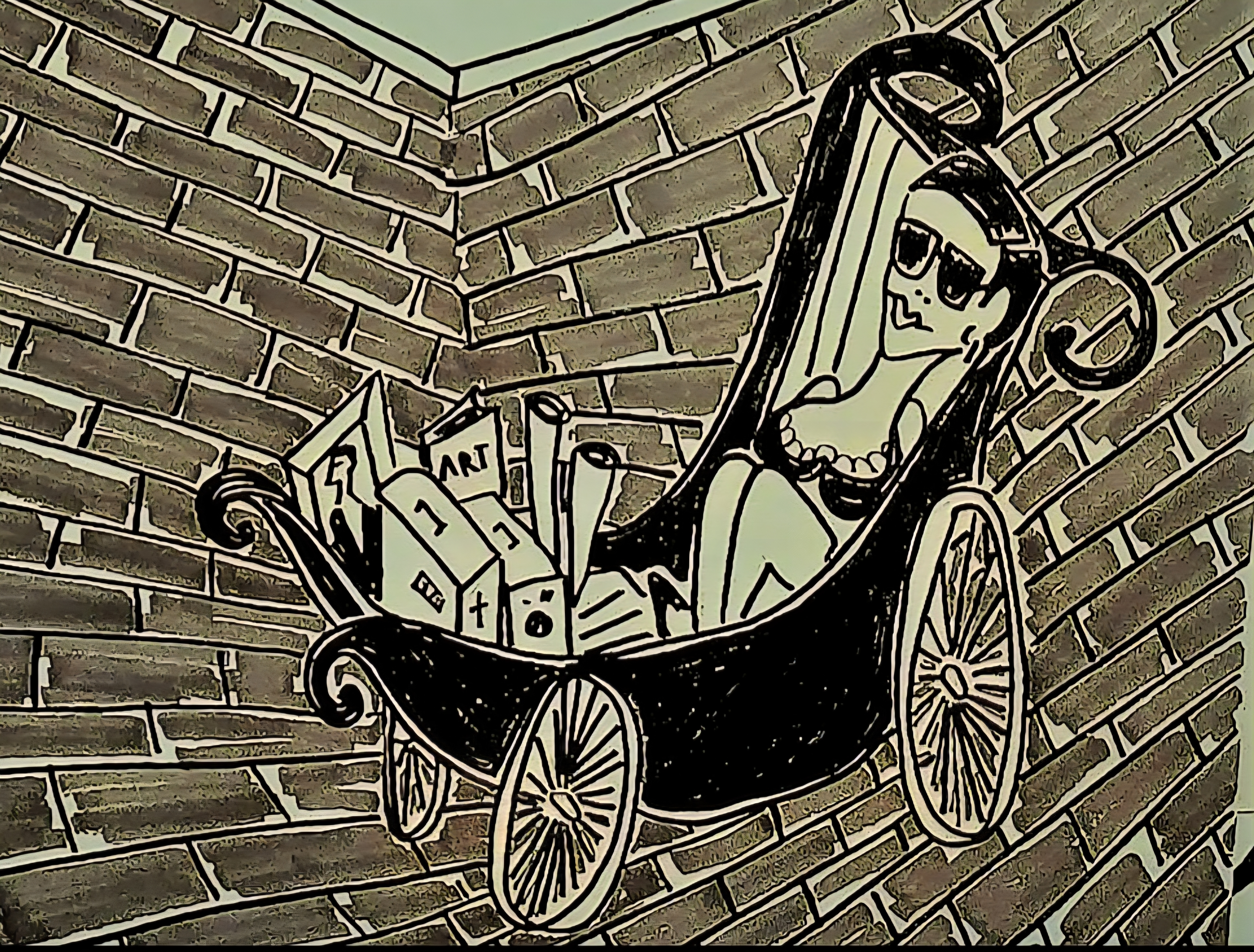Avanza in un carretto traballante, carico delle sue pertinenze.