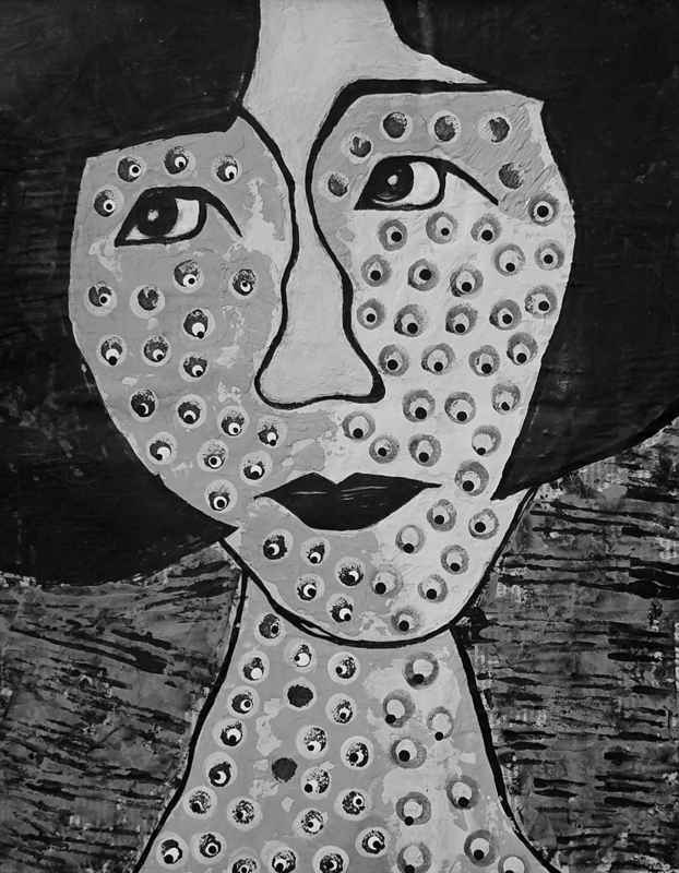 El rostro de Viral se multiplica en una piel-mosaico de ojos. Es como si la mirada se hubiera clonado hasta el infinito.